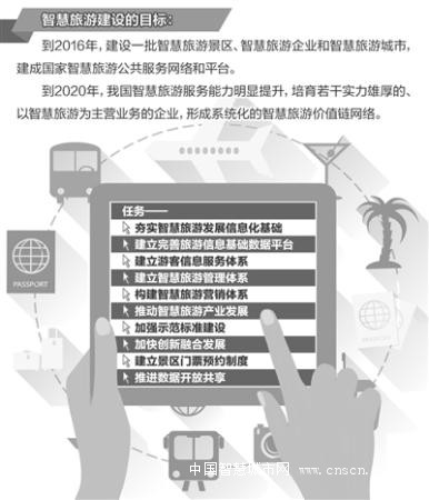 对此,国家旅游局近日印发的《关于促进智慧旅游发展的指导意见》提出,到2016年,建设一批智慧旅游景区、智慧旅游企业和智慧旅游城市,建成国家智慧旅游公共服务网络和平台。到2020年,我国智慧旅游服务能力明显提升,智慧管理能力持续增强,大数据挖掘和智慧营销能力明显提高,移动电子商务、旅游大数据系统分析、人工智能技术等在旅游业应用更加广泛,培育若干实力雄厚的、以智慧旅游为主营业务的企业,形成系统化的智慧旅游价值链网络。