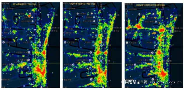通过图4的2小时人群分布热力图可以看出,三个节日当晚人流量基本相当,不过分布不同。中秋节(图4(1))和国庆(图4(2))人群主要分布在外滩观景大道和陈毅广场附近,而在跨年当天22点之后(图4(3)),人群主要分布在中山东一路、陈毅广场和外滩源附近。