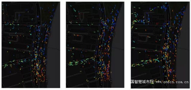 图5采样选取了部分人群,示意他们的运动方向。图中,每个箭头代表一名行人,箭头的颜色及指向表示其前进方向。图5(3)可以看出,跨年当晚人群从南京东路流向陈毅广场,导致在晚上21点左右,陈毅广场的人流量达到一个峰值(图3)。而之后,更多的人群开始从陈毅广场沿着中山东一路流向北部的外滩源,也就是事发当天灯光秀所在地。