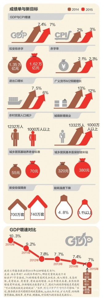 政府工作报告提出将2015年GDP增速定为7%左右。由去年的7.4%到今年的7%,哪些变量促成这个目标出炉?宁吉喆说,7%的增速考虑到充分就业、收入增长、生态环保,是有就业、有质量、有效益的增速。从去年情况来看,虽然经济增速有所放缓,但新增就业数量扩大了,因此7%的经济增速是考虑到“可以实现比较充分的就业”。“当然,增速过低肯定对经济有影响。”不过,报告提出系列稳增长的政策措施,包括改革开放、扩大内需、结构调整等措施,强改革、更开放、硬措施,对实现7%的目标是充满信心。