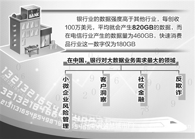 这个神奇的故事,正说明大数据技术对银行业务模式创新的作用。近日,波士顿咨询公司发布了《互联网金融生态系统2020系列报告之大数据篇》,该报告显示,银行业的数据强度高于其他行业,每创收100万美元,平均就会产生820GB的数据,而在电信行业产生的数据量为460GB,快速消费品行业这一数字仅为180GB。“海量高价值数据的积累,使银行业在发展大数据能力方面具有天然优势。”波士顿咨询公司董事经理张越告诉记者。