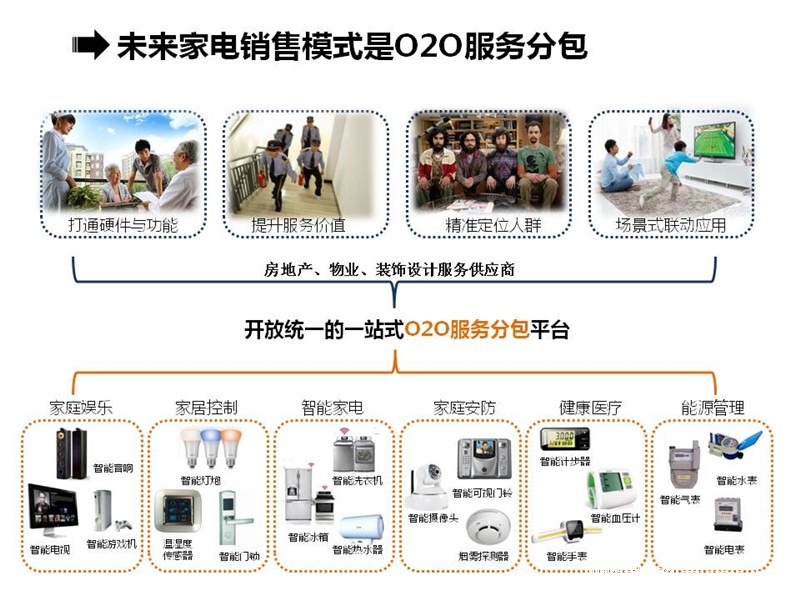 就在大家一心一意建设渠道的同时,家电产品的商业模式却正在悄悄发生巨大变化。过去家电销售主要是直接面向大众消费者(2C),其特点是功能单一、独立工作,家电品牌厂商缺乏核心技术竞争力,渠道为王。随着智慧家庭产业的兴起,硬件和价值开始分离,产品核心价值从技术创新转移至应用创新,传统渠道商需要向O2O服务分包商转型,从服务获取更大利润。