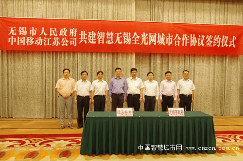 6月4日,无锡市人民政府与中国移动江苏公司签订战略合作协议,共同推进“智慧无锡·全光网城市”建设。按照国家“互联网+”和“宽带中国”战略的总体要求,双方积极推进全光网智慧城市建设,促进信息化与工业化“两化”融合,在信息通信基础设施建设、电子政务、城市管理、经济运行和为民服务等方面加大合作力度。无锡市政府市长汪泉,副市长曹佳中,市政府秘书长叶勤良、副秘书长周浩明,中国移动江苏公司总经理王建,中国移动江苏公司无锡分公司总经理谢生勃,以及市相关部委办局负责人参加签约仪式。