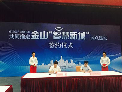 昨天下午,上海市经济和信息化委与金山区人民政府联合主办共同推进金山智慧新城试点建设签约仪式,市经信委副主任邵志清与金山区政府副区长刘健代表双方单位签订了《上海市经济和信息化委员会与金山区人民政府推进金山智慧新城试点建设战略合作框架协议》,市商务委、市交通委、市安监局等市、区两级相关职能部门参加了签约仪式,上海电信、上海移动、东方网、万达信息等来自全国各地的21家信息产业领域知名企业、机构、行业协会应邀参加,并分别与金山区政府和金山区科委签订了推进金山智慧城市试点建设的合作协议,金山区政府区长胡卫国见证了签约仪式并作重要讲话。