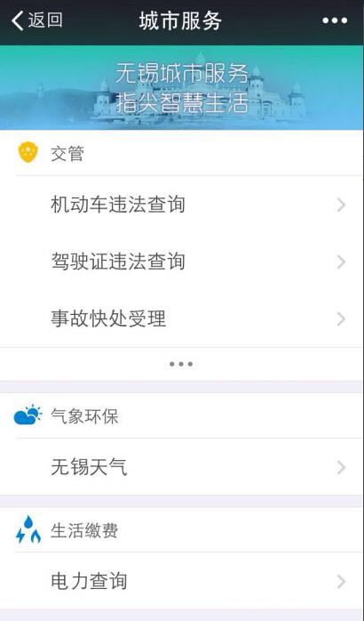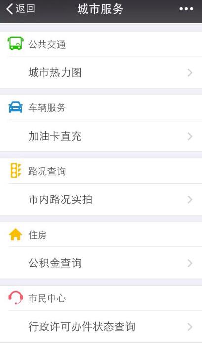 无锡微信“城市服务”首批上线的功能包括:机动车违法查询、驾驶证违法查询、路况查询、事故快处受理、事故快处查询、电力查询、天气预报、公积金查询、行政许可状态查询、加油卡充值、城市热力图等11项。