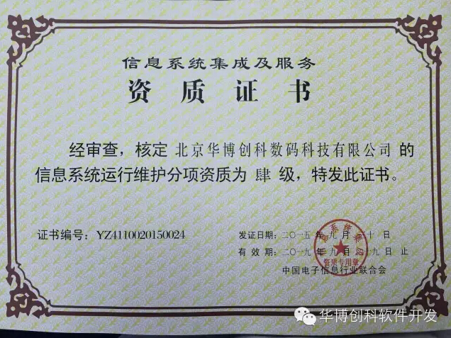 北京华博创科数码科技有限公司一直致力于软件开发领域,此次获得由中国电子信息行业联合会颁发的信息系统运行维护分项资质 肆级 也标志着华博创科作为专业的软件开发企业在系统运维领域将更上一层楼。