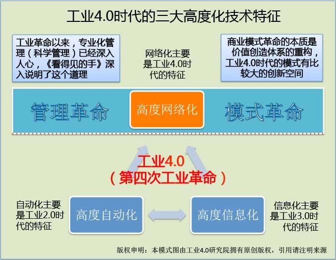 因此,自动化和信息化不一定需要割裂来看,完全可以融为一体,当然,加上另外一个工业4.0特有的功能——网络化,那就是工业4.0概念所包含的核心内容,也就是工业4.0研究院提出的三个高度化特征。