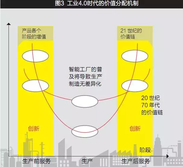 专访记者:依据迈克·波特所构建的竞争分析模型,您分析出,21世纪的产业价值链与19世纪70年代的价值链的差异(如图)——我用的词是“微笑的更明显了”。智能工厂的普及将导致生产制造“无差异化”,即意味着拥有先进技术、信息和智能的工厂依然是价值创造的环节,但在未来的价值链中占据的地位却是下降的。这将给很多热衷于花巨资投资建设智能工厂的企业家算是泼了盆冷水!但从工业4.0的发展演进来说,智能工厂的建设也是必经之路。您如何看待这种纠结?建议是什么?