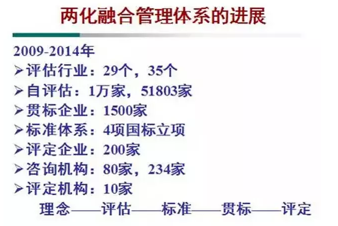 2009年以来,经过全行业的共同努力,两化融合管理体系这项工作取得重要进展。把最初的一套理念变成了行业共识,把行业共识变成了一套管理体系标准,把这套标准作为引领企业信息化转型的指南,作为各地推动两化深度融合的重要抓手。目前,35个行业5万多家企业参加评估。500多家企业开展两化融合管理体系贯标,4项国标立项,200家企业通过评定,80家推荐的贯标咨询服务机构,234家贯标咨询服务机构在管理体系工作平台上注册,10家评定机构开展评定工作。
