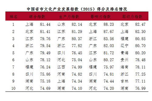 中国省市文化产业发展指数(2015)结果指出,我国各省市文化产业总体保持持续稳步增长,各省市综合指数排序与2014年相比有小幅变动,上海、北京、江苏名列前三甲,福建、四川进入全国前十名。生产力指数方面,各省市排名与2014年相比整体上变化浮动较小。驱动力指数方面,和2014年相比,上海、福建、海南、吉林、四川等省份上升幅度较大。影响力指数方面,东部地区文化产业经济影响和社会影响比较明显,前十名的省市中,就有8个来自东部沿海发达地区。