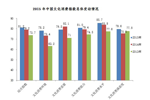 中国文化消费指数(2015)通过对覆盖全国31个省市, 涉及城乡、性别、年龄、学历等各类人群的文化消费数据进行分析计算得出。指数结果显示,我国文化消费综合指数由2013年的73.7增至2015年的81.2,平均增长率为5%。文化消费环境、文化消费能力、文化消费水平指数等一级指标均呈上升趋势,且文化消费环境指数上升速度最快,平均增长率为11.33%,文化消费意愿指数在经历了2014年的上涨后,有小幅回落,文化消费满意度指数在2014年有所下降后,出现了大幅提升。