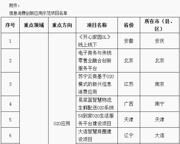 为贯彻落实《国务院关于促进信息消费扩大内需的若干意见》(国发〔2013〕32号),带动各地增强信息消费供给,挖掘信息消费潜力,形成新的信息消费增长点,我部组织开展信息消费创新应用项目示范和推广工作,经国家信息消费试点市(县、区)的推荐申报、各省工业和信息化主管部门预审、专家评审等环节,遴选出60个信息消费创新应用示范项目,现予公布。