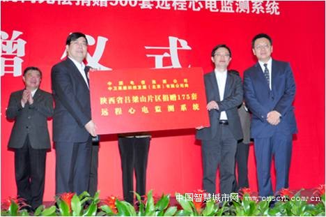 图2:中国电信政企事业部总经理韩臻聪代表中国电信集团公司向陕西省卫生厅捐赠175台“健康心翼”远程心电监测系统