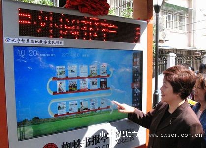 近日,一种新型“户外电子阅报栏”悄然走进上海市长宁区多个社区。手指轻点,即可翻阅当天近百种报刊杂志,连不会电脑的老人都能轻松使用,随时查看天气预报、公交、时令养生等便民信息——这个被戏称为“大ipad”的新型触屏式报栏最近在小区人气颇高。
