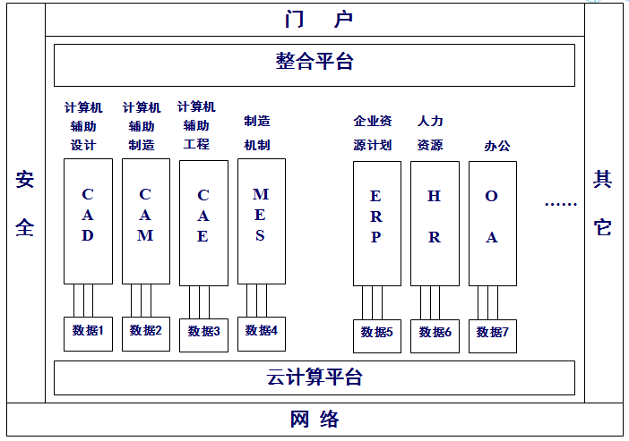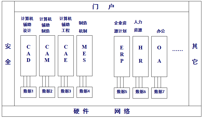 经过几十年的建设,多数企业都建立了适合企业生产和管理的软件系统,如:CAD、CAM、CAPP、CAE、PDM、ANSYS、MES等工业生产软件,和OA、ERP、CRM、HR等工业管理软件,这些软件系统在企业的生产、加工、实验、工艺、模型、标准、规范、图纸、产品知识库、人力资源、财务、技术、办公等领域,发挥了重大作用。如下图,形成了一个一个相对独立的系统,这一个一个 独立软件系统,就相当于孤立的孤岛,他们之间独立运作而没有联系。