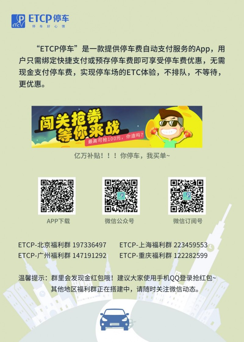 新年伊始,万象更新,各种节日也接踵而至,圣诞节没玩儿尽兴,没关系,元旦的脚步声已悄悄临近。据停车场整合平台ETCP官网透露,12月31日,将在北京举办“元旦大放送”主题活动。凡在百脑汇北京旗舰店、北辰亚运村汽车交易市场、东方银座(地下)指定三家停车场,以及北京地区其他ETCP停车场停车,并在ETCP停车客户端完成停车费支付,即当场得到为您精心准备的礼品。礼品超实用,送男友送老婆送闺蜜,绝对够创意够浪漫,让您在新的一年中更添喜气。先到先得,机会不容错过,在本年度的最后一天,体验全新的停车模式,为2016年开启全新生活方式!请大家积极转发,后续回馈用户活动会在“ETCP智慧用车”公众号第一时间发布,敬请关注!