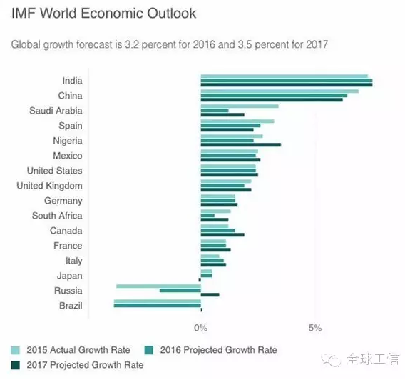 虽然上调了中国GDP增长率,然而未来依然保持整体减速的趋势。预计今年在6%左右,2017年会进一步降低。印度再次被寄予厚望,去年,其经济增速已经超过中国,接下来也将如此,而且GDP增长率将提升,即呈现加速奔跑的状态。当然,有人对此不以为然,认为印度面临很难突破的诸多地方特色的民主、宗教、基础设施、土地等问题,即使莫迪这样的改革派政治家,也举步维艰。
