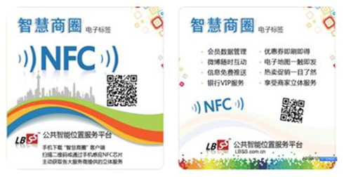 智慧商圈-电子标签:是“智慧商圈”服务平台上的一种技术沟通方式。它以一块由PVC材料构成的标签牌,内含NFC智能服务芯片,表面印有唯一的二维码服务标记。2合1的技术实现方式,使得每个拥有智能手机的用户都能使用本芯片。