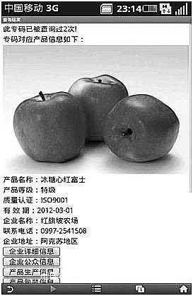 2011年11月,“阿克苏二维码林果业溯源系统”正式上线应用,实现了特色林果产品的生产、监管、销售、消费等环节中追溯功能。名扬海内外的阿克苏红旗坡“冰糖心红富士”苹果终于有了正式的“身份证”。