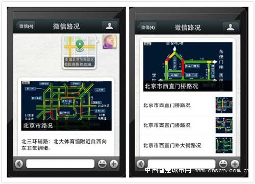 在最终的呈现方式上,“微信路况”与“外卖网络”非常类似。添加好友后,你只需点击微信下方+号里面的“位置”或者直接回复你所在的“地点”(分享自己的地理位置),它就会通过文字与图片的形式告诉你周围近3公里内的路况信息。同样,如果你想查询某条道路的交通情况,直接输入那条道路名称也可以获得附近的路况信息。上图(右侧)是我测试输入“西直门”的结果。