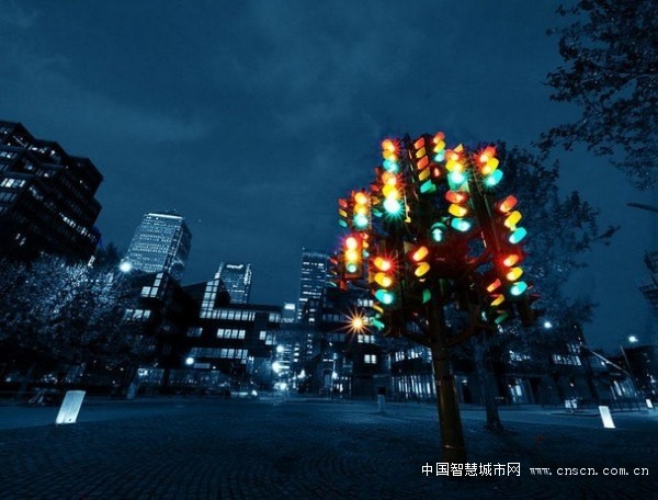 伦敦交通灯一个环形交通枢纽口,看上去,它就像是一个挂满彩灯的树。信号灯树由一个高达28尺的钢柱支撑,总共有75个信号指示集,按照自己的固有频率“指示”信号。