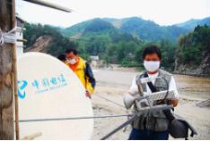 2008年5月20日,中国电信工作人员在汶川地震后的青川县灾区抢修通信线路