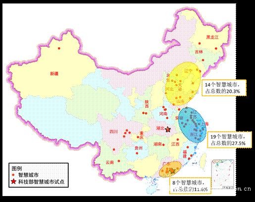 一是中国智慧城市建设渐入高潮。截止到2012年12月,我国在建的智慧城市数量已达69个,密布在环渤海、长三角和珠三角地区,三大区域的智慧城市数量占据了总数的59.4%。其中,环渤海地区有14个,占总数的20.3%;长三角地区有19个,占总数的27.5%;珠三角地区有8个,占总数的11.6%。此外,武汉城市群、成渝经济圈、关中-天水经济圈等中西部地区也已经呈现出较好的发展态势。中国智慧城市建设已形成沿海地区聚集、中西部热点涌现的总体建设格局。