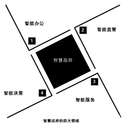 智慧政府包括智能办公、智能监管、智能服务、智能决策四大领域。在智能办公方面,智能化的OA系统具有个性化、自动提醒、排序、知识库等功能,能够根据公务员的职务、职责生成个性化的功能模块组合及用户界面,对代办事项、会议通知等进行提醒等,根据代办事项的轻重缓急进行排序,根据工作需要获取相关专业知识。