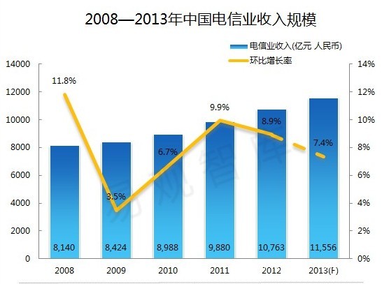 根据EnfoDesk易观智库研究表明,2012年中国电信行业主营业务收入达10763亿元,同比增长8.9%,相比2011年增速有所回落。