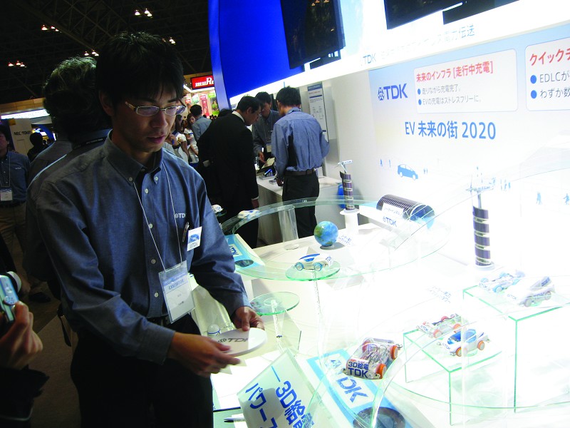 此外,TDK还展示了用于智能手机、普通手机、无线局域网等的功率放大器电路以及高频匹配电路的最小0402尺寸的薄膜电容器Z-match TFSQ0402系列。该产品将TDK多年来在HDD磁头制造方面所积累的“薄膜技术”用于高频元件的生产工艺中,同时实现了面向智能手机等高性能移动设备和高频模块产品的高特性与小型超薄化。尤其值得一提的是,凭借薄膜工艺,该产品具备了优良的窄公差特性,并通过薄膜材料和最佳形状设计,与以往产品相比达到了150%的高Q特性(2.2pF、2GHz)。TDK的技术人员介绍说,该产品通过采用底面端子结构和高精度切割工艺,实现了较以往产品更高的尺寸精度,在需要高密度封装的模块中也可实现稳定的封装。