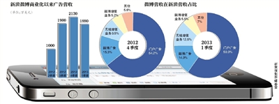 在今年2月公布的2012年财报中,新浪首度公开了微博收入——2012年全年为6600万美元,其中广告收入占比为77%——新浪将广告主导的门户盈利模板延伸至了微博。