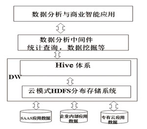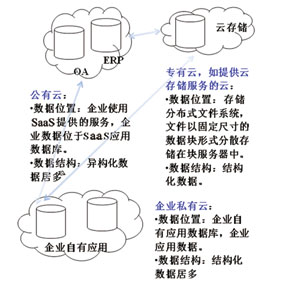 ★ 多源数据:引入云计算后,企业数据的位置有可能在提供公有云服务的平台上,也可能在企业自建的私有云上,如何面对不同的数据源进行挖掘也是一个挑战。 如图1所示。