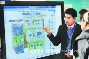 在东直门交通枢纽信息服务平台演示区,与会嘉宾通过大屏幕观看枢纽内车辆运行及各区域乘客流量的实时监测图。