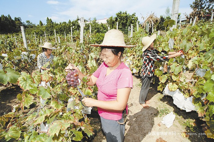 恩阳区何家坝葡萄种植专业合作社员工在葡萄种植园区采摘成熟的葡萄。去年该合作社申请通过国家绿色食品认证,投产的优质葡萄品种采用现代设施栽培,分批量上市,自每年的7月初开始一直可延续到10月左右。
