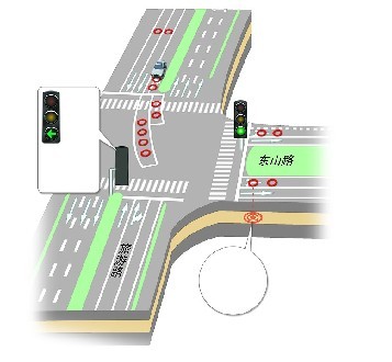 今年4月份,阳光新路经十路路口东口200米处,靠近护栏的第二条车道上方安装了一个新型的智能电子显示屏。在第一排左转车道停止线70米和200米处分别埋设两组感应线圈,当排队长度超过200米且等待时间超过10秒钟时,智能可变车道自动变为左转车道;当排队长度小于70米时,智能可变车道自动变为直行车道。