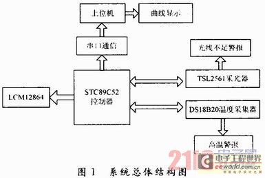 系统总体设计是基于上位机利用串口通信与单片机环境监控系统设计,由上位机、通信接口和下位机三部分组成。微控制器采用STC89 C52;光传感器采用TSL2561;温度传感器采用DALLAS公司生产的DS18B20。单片机将传感器采集到的数据通过串口通信方式传输给PC机,PC机将获得的数据实时显示在监控画面中,同时实时显示温度曲线和光照曲线。系统总体结构如图1所示。