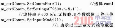 在VC 6.0下,采用其自带的MSComm控件,可以实现单片机与PC机的串口通信,利用RS 232实现数据的接收。在此,选择com1口,波特率为9 600 b/s,以二进制方式检取数据,主要代码如下: