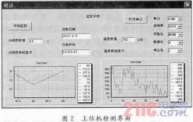 本文基于STC89C52,在VC 6.0的环境下提供了一种农业大棚光照与温度检测系统。其光传感器TSL2561和温度传感器DS18B20均是高精度测量传感器,是一个具有高精度、远程监控的检测系统。上位机界面为友好的动态曲线观测,可供用户方便地查看和记录数据。同时,本设计的下位机还可以实现多点测控,具有很强的扩展能力,性价比高,实用性强。