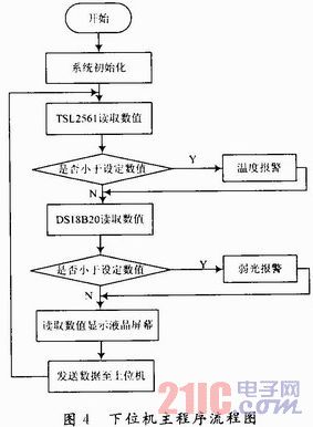 该设计中单片机部分采用模块化设计,通过Keil公司开发的μVision 4编译器用C语言编写,主要包括光强采集、温度采集、液晶显示,以及串口发送模块程序。上位机部分在VC 6.0环境下,通过VC++语言进行编写,其中包括串口通信、数据库保存和曲线绘制模块。上、下位机主程序流程图如图3、图4所示。